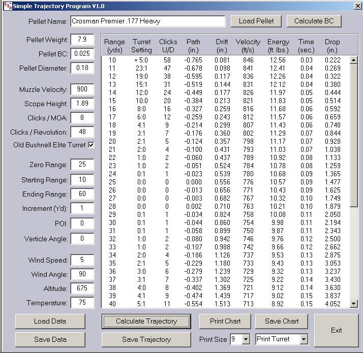 Detta program har utvecklats av Brad Troyer. Det är ett Windows XP-program och har inte testats på tidigare versioner av Windows. Det har ett enkelt gränssnitt (se bild nedan). Du måste veta den ballistiska koefficenten på dina kulor. Det finns en räknare med i programmet som beräknar BK, därefter ges hastighetavläsningar på ett fast avstånd. Det finns en readme-fil som förklarar programmet och gränssnittet.